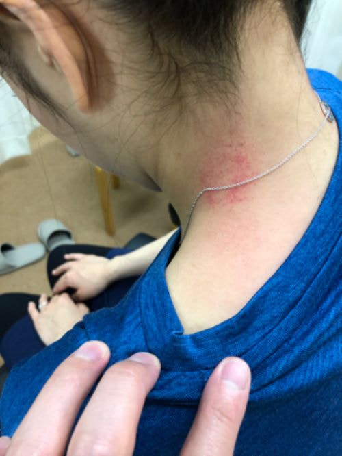 写真のように筋膜調整を加えると、問題部位に細かな内出血点が生じます、この内出血点の部位に癒着が生じていた結果になります。