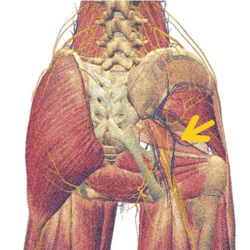 坐骨神経がお尻を通る際に、問題が起こりやすい「梨状筋」と呼ばれる筋肉を確認。